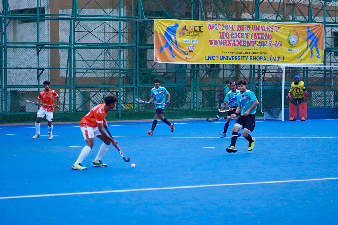 भोपाल। एलएनसीटी विश्वविद्यालय, भोपाल द्वारा एआईयू (ऑल इंडिया यूनिवर्सिटी) के तत्वावधान में आयोजित वेस्ट ज़ोन इंटर यूनिवर्सिटी हॉकी (पुरुष) प्रतियोगिता 2025–26 के तीसरे दिन मेजर ध्यानचंद हॉकी स्टेडियम, मयूर पार्क, भोपाल में बेहद रोमांचक मुकाबले खेले गए।