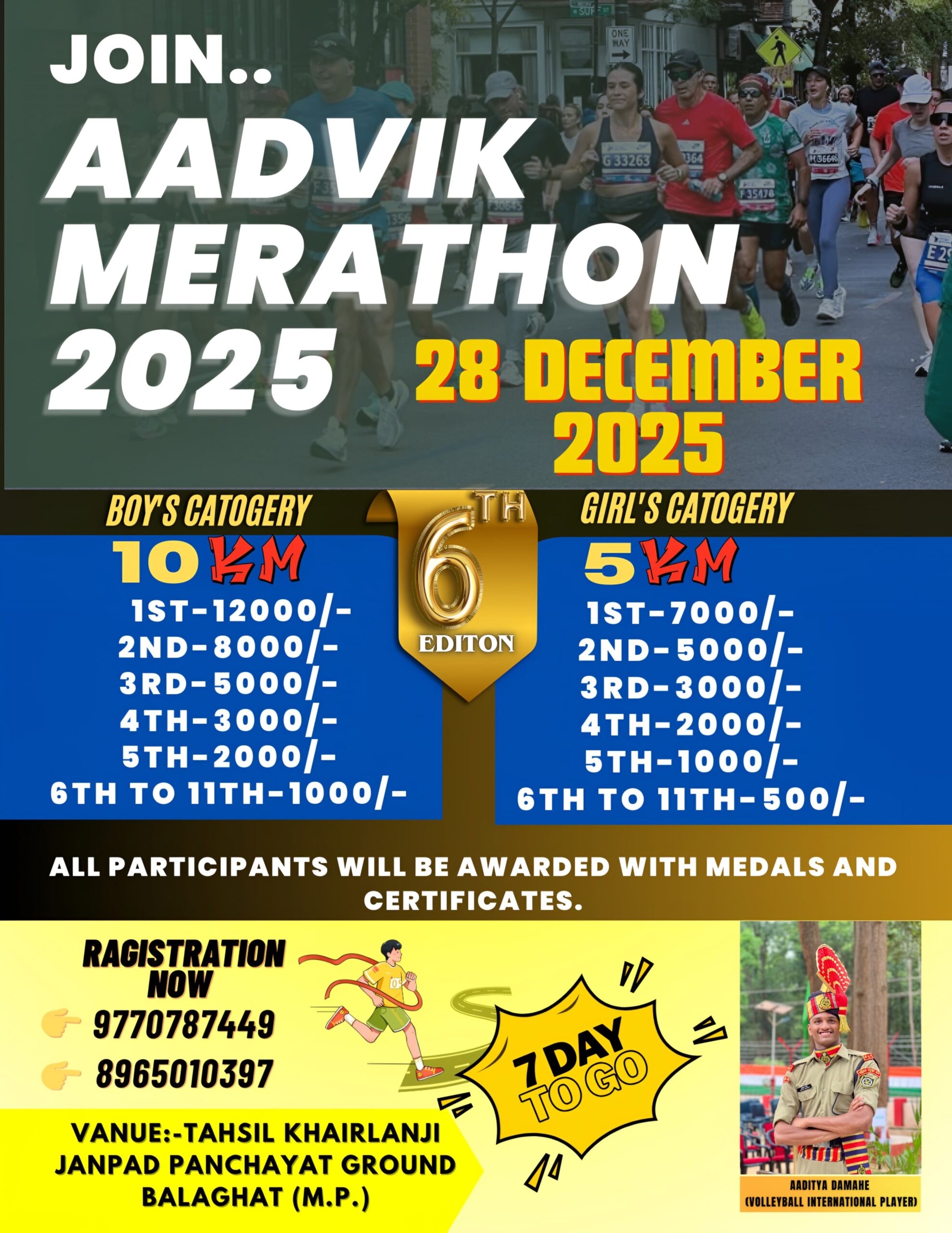 ग्रामीण प्रतिभाओं को सशक्त मंच प्रदान करने, बच्चों के सर्वांगीण शारीरिक-मानसिक विकास और स्वस्थ समाज निर्माण के उद्देश्य को लेकर बालाघाट जिले के खैरलांजी तहसील में एक ऐतिहासिक खेल एवं सामाजिक आयोजन की तैयारियाँ जोरों पर हैं। समृद्ध महाकौशल फाउंडेशन, खैरलांजी के तत्वावधान में आगामी 28 दिसंबर 2025, रविवार को आद्विक मैराथन का भव्य एवं ऐतिहासिक आयोजन किया जा रहा है। यह मैराथन न केवल एक खेल प्रतियोगिता होगी, बल्कि स्वस्थ जीवनशैली, अनुशासित युवा शक्ति और जागरूक ग्रामीण समाज की दिशा में एक प्रेरणादायी अभियान के रूप में आयोजित की जा रही है। आयोजन की शुरूआत सुबह 8 बजे मैराथन दौड़ से होगी, जबकि प्रातः 10 बजे से मंचीय कार्यक्रम का आयोजन किया जाएगा। ग्रामीण बच्चों को मिलेगा आगे बढ़ने का अवसर आयोजन का प्रमुख उद्देश्य ग्रामीण अंचल में छिपी खेल प्रतिभाओं को पहचान दिलाना, बच्चों व युवाओं को नशामुक्त एवं स्वस्थ जीवन के लिए प्रेरित करना तथा शिक्षा के साथ-साथ खेलों को जीवन का अभिन्न अंग बनाना है। आयोजकों का मानना है कि खेल न केवल शरीर को मजबूत बनाता है, बल्कि अनुशासन, आत्मविश्वास और नेतृत्व क्षमता का भी विकास करता है।